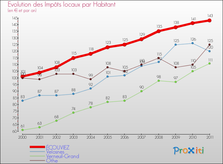 A Écouviez, les impôts locaux par habitant ont donc augmentés de 41.58 % entre 2000 et 2011.