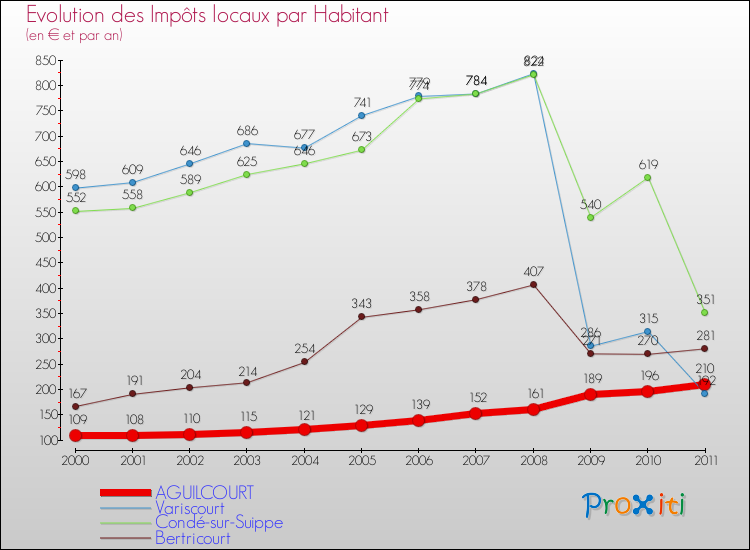 A Aguilcourt, les impôts locaux par habitant ont donc augmentés de 92.66 % entre 2000 et 2011.