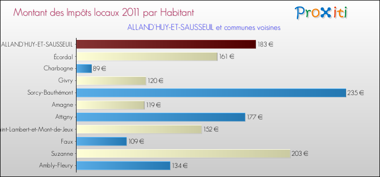 A noter : la valeur moyenne des impôts locaux dans les communes françaises similaires à Alland'Huy-et-Sausseuil était de 238 € par habitant, en 2011.