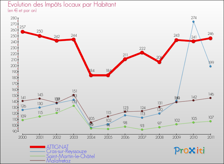 A Attignat, les impôts locaux par habitant ont donc baissés de 4.28 % entre 2000 et 2011.