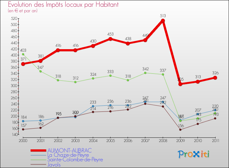 Pendant la même période, les communes françaises similaires à Aumont-Aubrac, ont vu leurs impôts locaux par habitant augmenter de 29.33 % en moyenne entre 2000 et 2011.