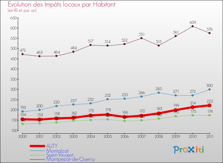 A Auty, les impôts locaux par habitant ont donc augmentés de 44.16 % entre 2000 et 2011.