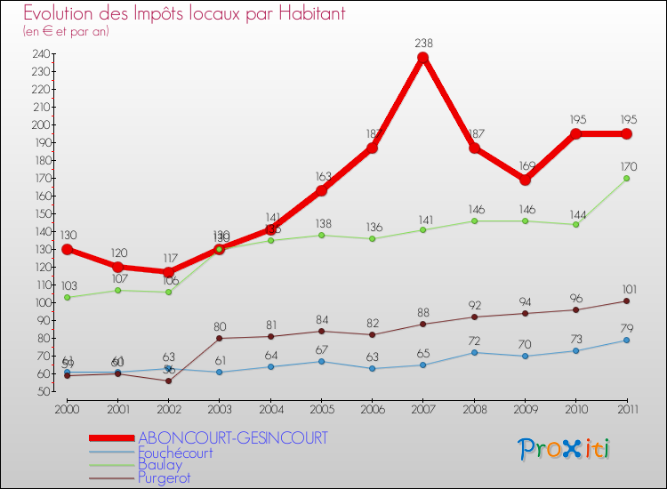 Pendant la même période, les communes françaises similaires à Aboncourt-Gesincourt, ont vu leurs impôts locaux par habitant augmenter de 149.68 % en moyenne entre 2000 et 2011.