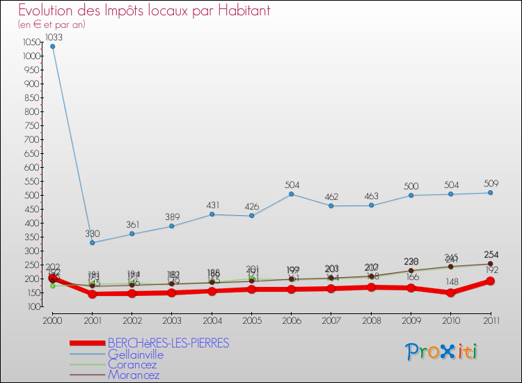 Pendant la même période, les communes françaises similaires à Berchères-les-Pierres, ont vu leurs impôts locaux par habitant baisser de 6.27 % en moyenne entre 2000 et 2011.