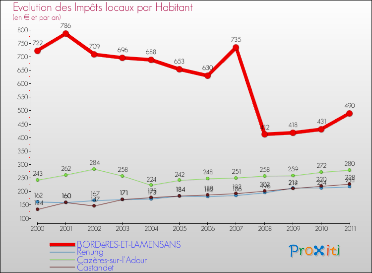 A Bordères-et-Lamensans, les impôts locaux par habitant ont donc baissés de 32.13 % entre 2000 et 2011.