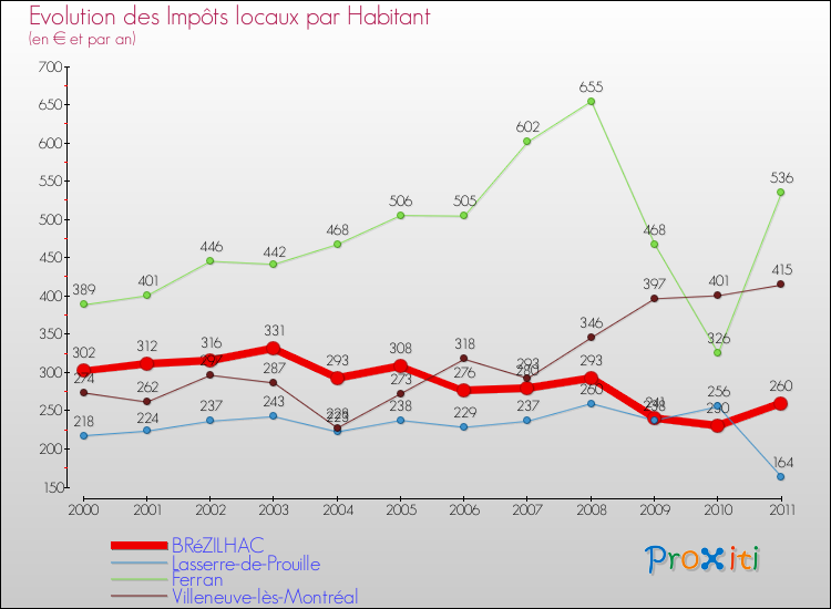Pendant la même période, les communes françaises similaires à Brézilhac, ont vu leurs impôts locaux par habitant augmenter de 16.1 % en moyenne entre 2000 et 2011.