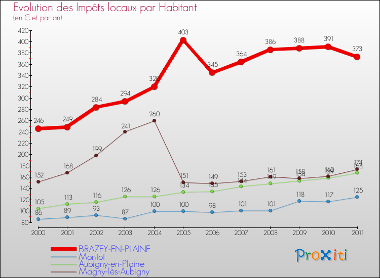 A Brazey-en-Plaine, les impôts locaux par habitant ont donc augmentés de 51.63 % entre 2000 et 2011.