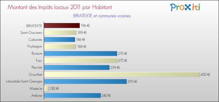 A noter : la valeur moyenne des impôts locaux dans les communes françaises similaires à Briatexte était de 269 € par habitant, en 2011.