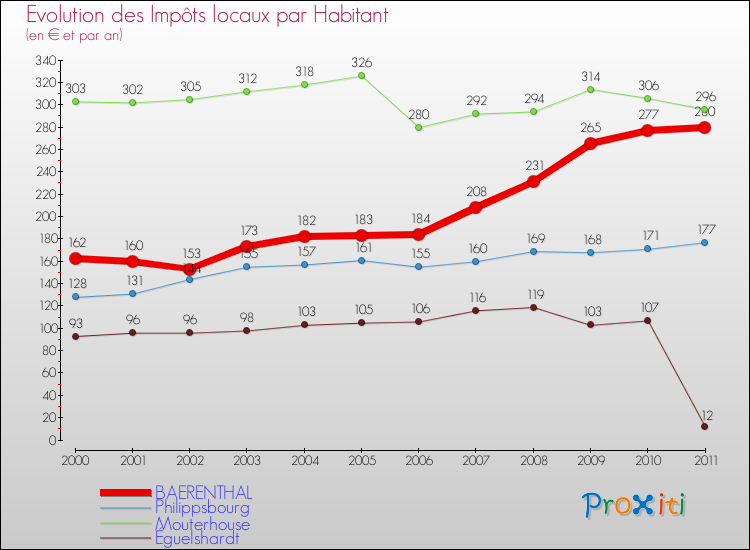 A Baerenthal, les impôts locaux par habitant ont donc augmentés de 72.84 % entre 2000 et 2011.