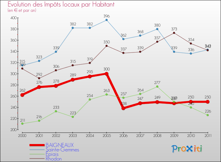 A Baigneaux, les impôts locaux par habitant ont donc baissés de 4.58 % entre 2000 et 2011.