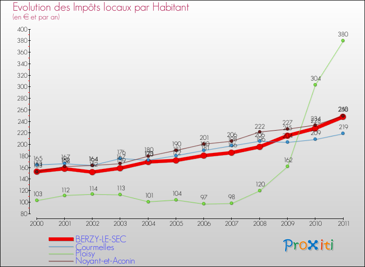A Berzy-le-Sec, les impôts locaux par habitant ont donc augmentés de 62.09 % entre 2000 et 2011.