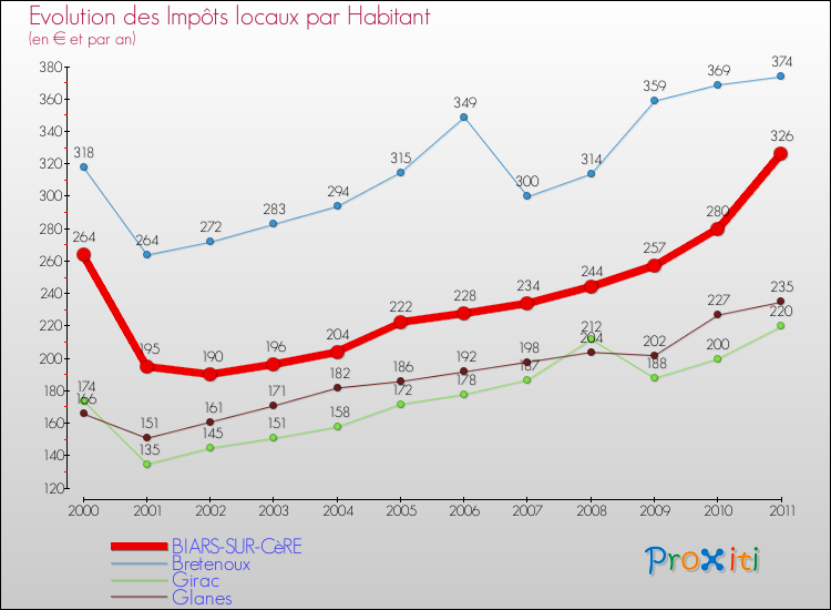 Pendant la même période, les communes françaises similaires à Biars-sur-Cère, ont vu leurs impôts locaux par habitant augmenter de 17.19 % en moyenne entre 2000 et 2011.