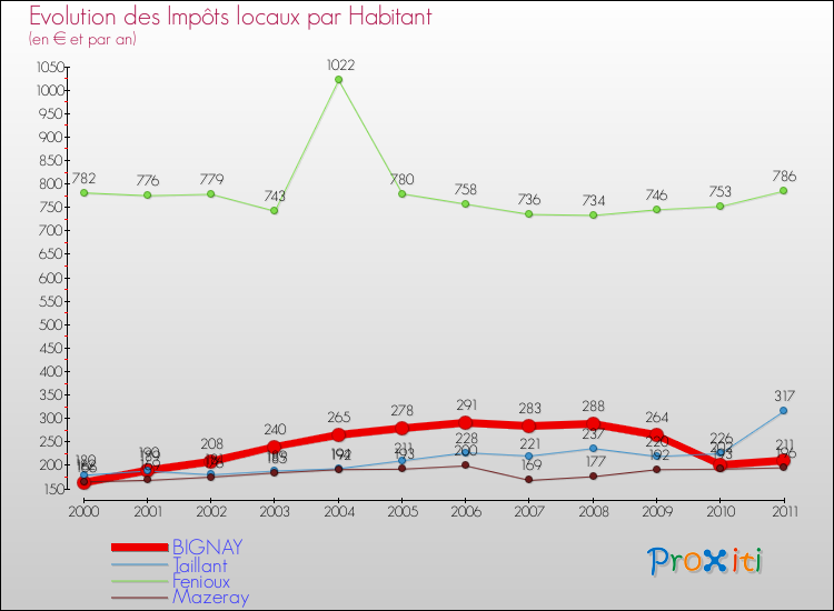 A Bignay, les impôts locaux par habitant ont donc augmentés de 30.25 % entre 2000 et 2011.