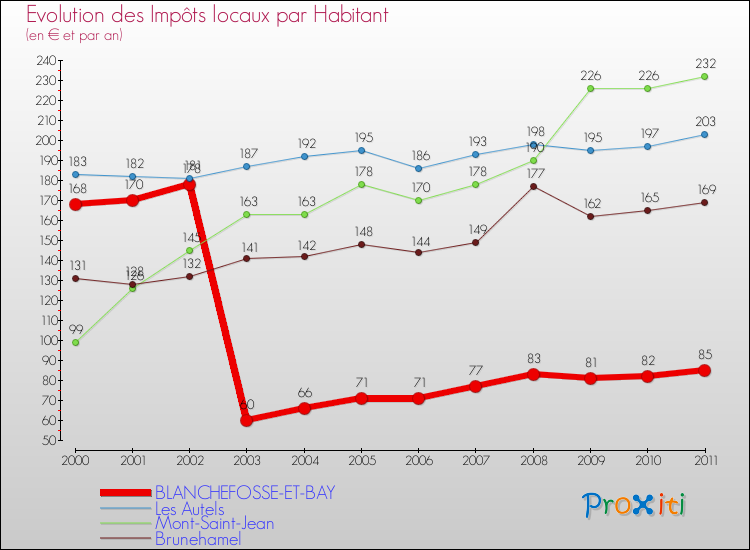A Blanchefosse-et-Bay, les impôts locaux par habitant ont donc baissés de 49.4 % entre 2000 et 2011.