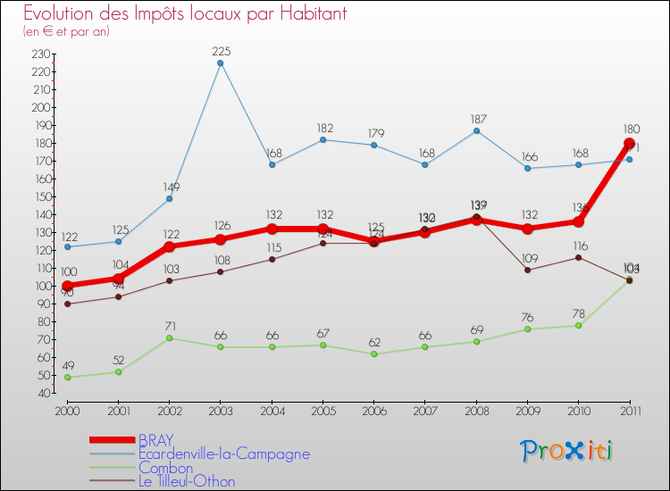 Pendant la même période, les communes françaises similaires à Bray, ont vu leurs impôts locaux par habitant augmenter de 70.32 % en moyenne entre 2000 et 2011.