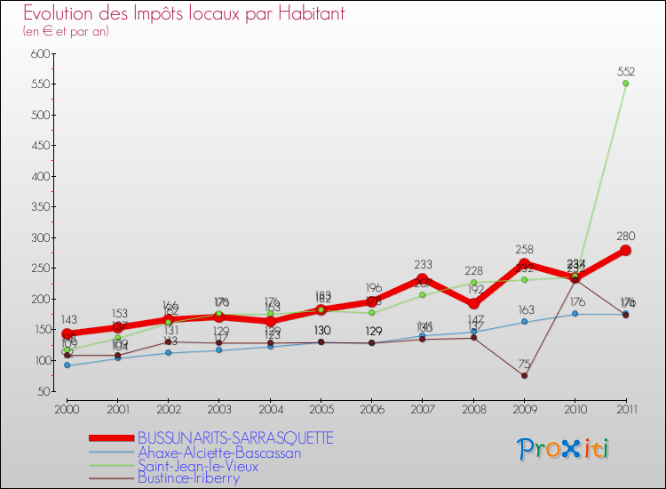 A Bussunarits-Sarrasquette, les impôts locaux par habitant ont donc augmentés de 95.8 % entre 2000 et 2011.