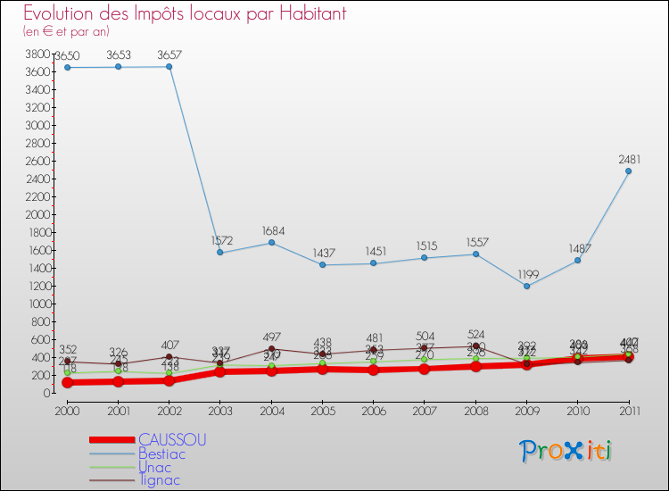 A Caussou, les impôts locaux par habitant ont donc augmentés de 244.92 % entre 2000 et 2011.