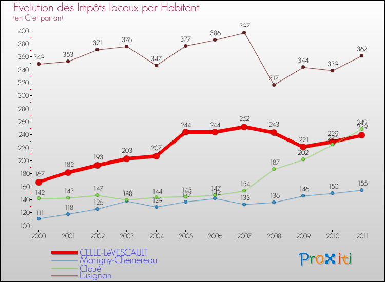 A Celle-Lévescault, les impôts locaux par habitant ont donc augmentés de 43.11 % entre 2000 et 2011.
