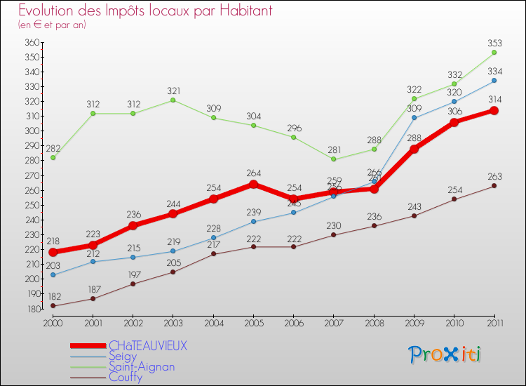 A Châteauvieux, les impôts locaux par habitant ont donc augmentés de 44.04 % entre 2000 et 2011.