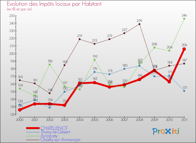 A Châtellenot, les impôts locaux par habitant ont donc augmentés de 63.49 % entre 2000 et 2011.
