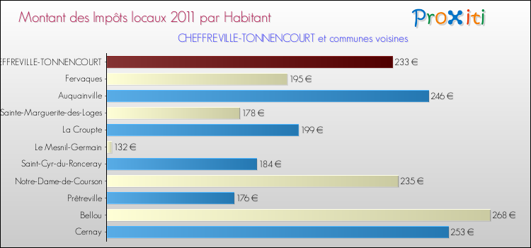 A noter : la valeur moyenne des impôts locaux dans les communes françaises similaires à Cheffreville-Tonnencourt était de 240 € par habitant, en 2011.
