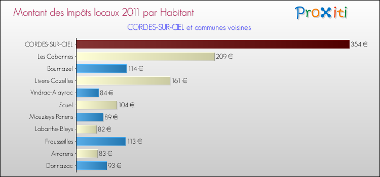 Par rapport aux 1 076 habitants de Cordes-sur-Ciel, en 2011 cela représente 354 € par habitant, soit : 1416 € par an pour une famille de 4 personnes.