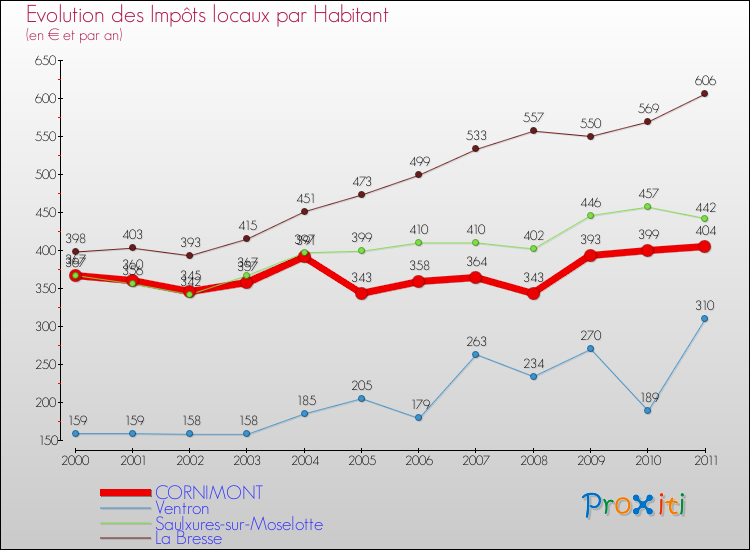 A Cornimont, les impôts locaux par habitant ont donc augmentés de 10.08 % entre 2000 et 2011.
