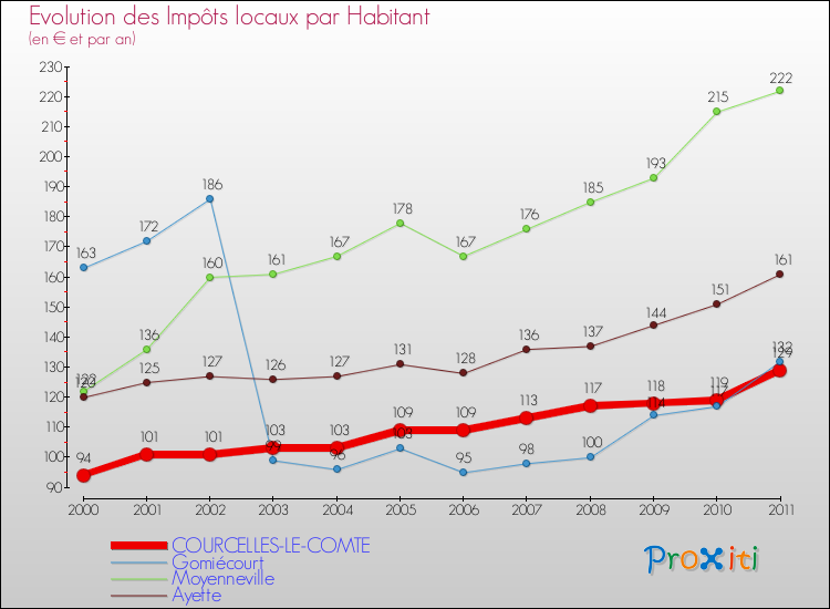 A Courcelles-le-Comte, les impôts locaux par habitant ont donc augmentés de 37.23 % entre 2000 et 2011.