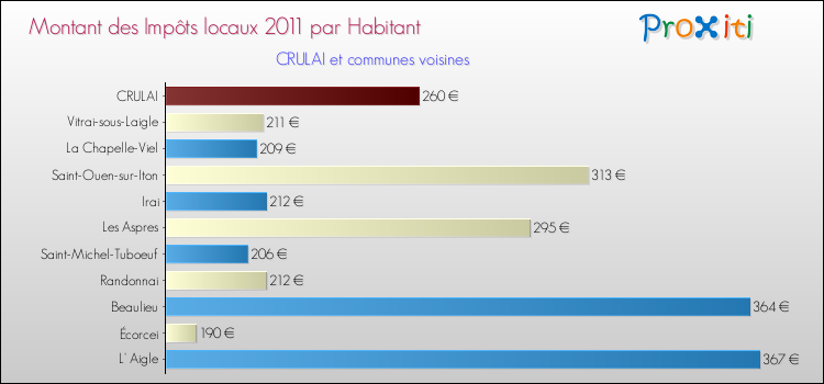 A noter : la valeur moyenne des impôts locaux dans les communes françaises similaires à Crulai était de 269 € par habitant, en 2011.
