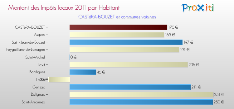 A noter : la valeur moyenne des impôts locaux dans les communes françaises similaires à Castéra-Bouzet était de 240 € par habitant, en 2011.