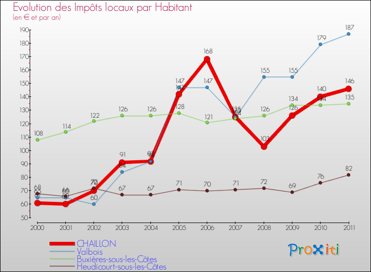 A Chaillon, les impôts locaux par habitant ont donc augmentés de 139.34 % entre 2000 et 2011.