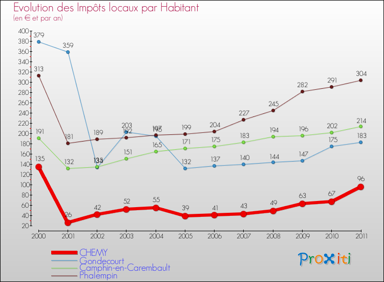A Chemy, les impôts locaux par habitant ont donc baissés de 28.89 % entre 2000 et 2011.
