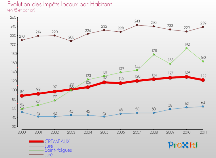 A Cremeaux, les impôts locaux par habitant ont donc augmentés de 40.23 % entre 2000 et 2011.
