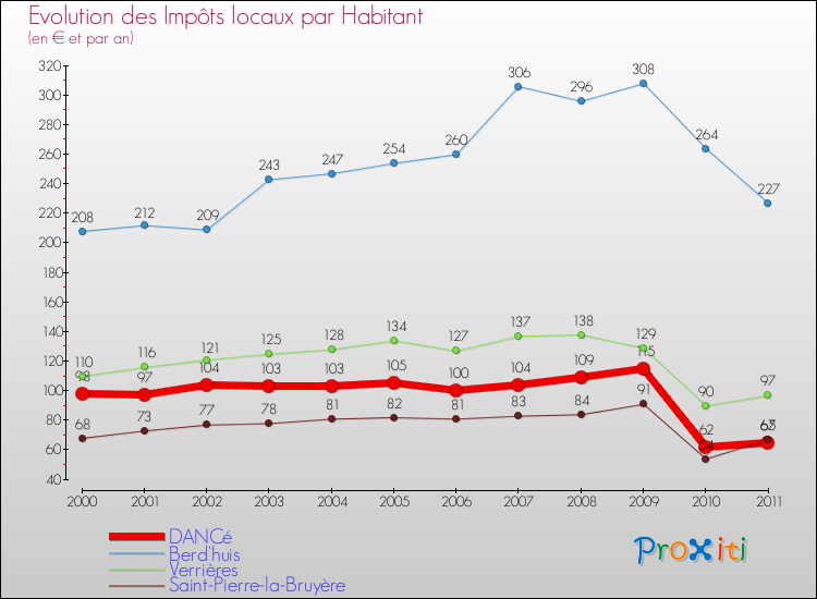 A Dancé, les impôts locaux par habitant ont donc baissés de 33.67 % entre 2000 et 2011.