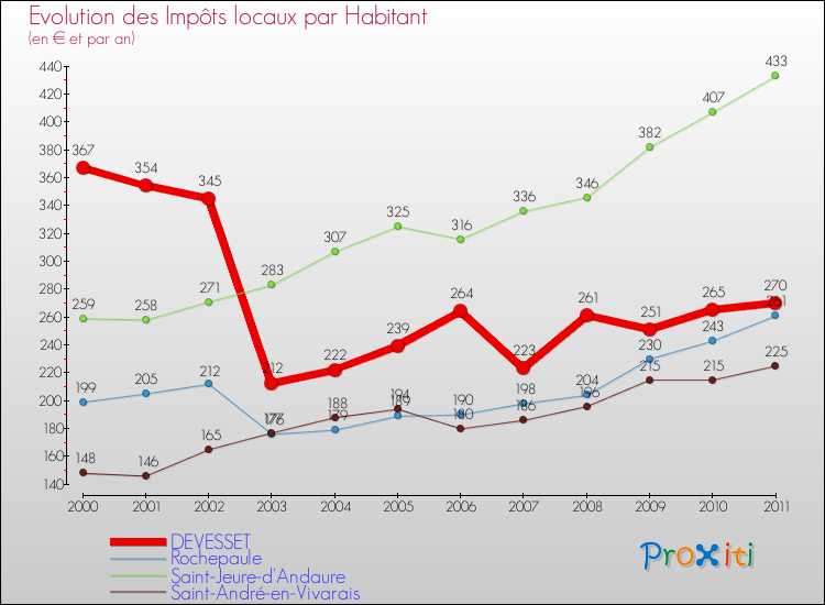 A Devesset, les impôts locaux par habitant ont donc baissés de 26.43 % entre 2000 et 2011.