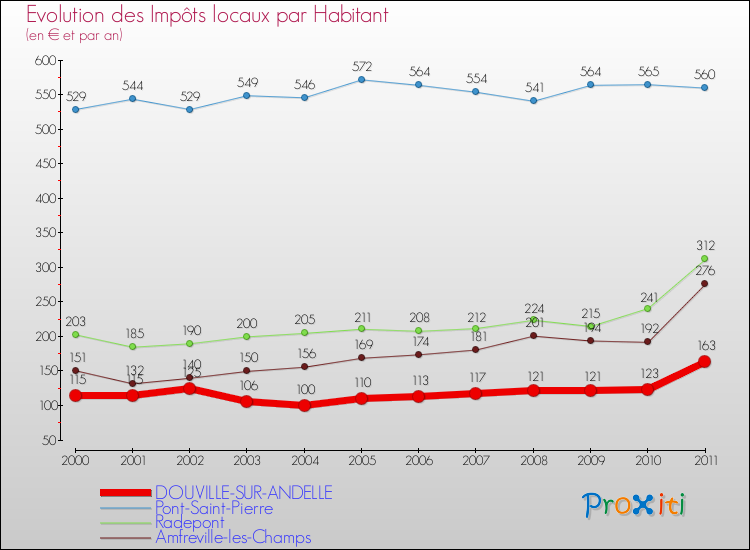 A Douville-sur-Andelle, les impôts locaux par habitant ont donc augmentés de 41.74 % entre 2000 et 2011.