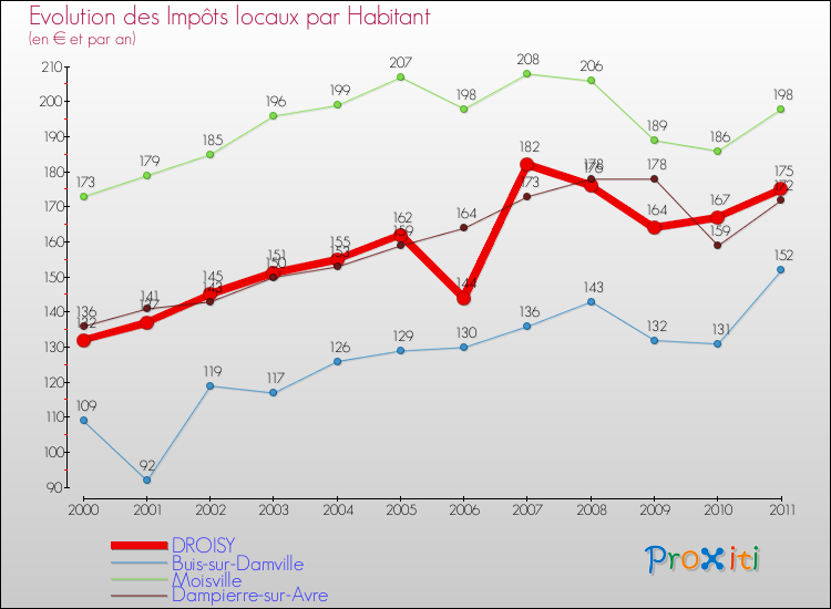 A Droisy, les impôts locaux par habitant ont donc augmentés de 32.58 % entre 2000 et 2011.