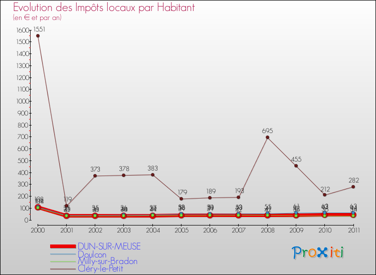 A Dun-sur-Meuse, les impôts locaux par habitant ont donc baissés de 59.26 % entre 2000 et 2011.