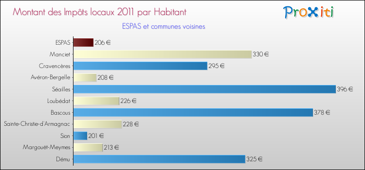 A noter : la valeur moyenne des impôts locaux dans les communes françaises similaires à Espas était de 386 € par habitant, en 2011.