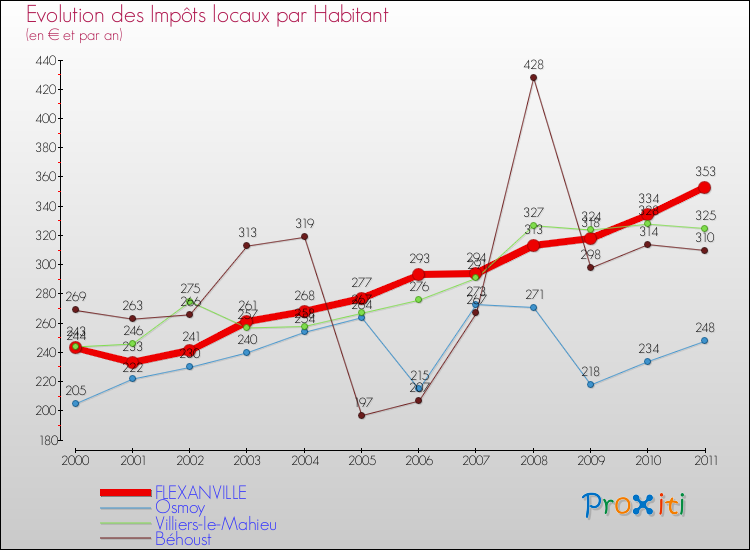 A Flexanville, les impôts locaux par habitant ont donc augmentés de 45.27 % entre 2000 et 2011.