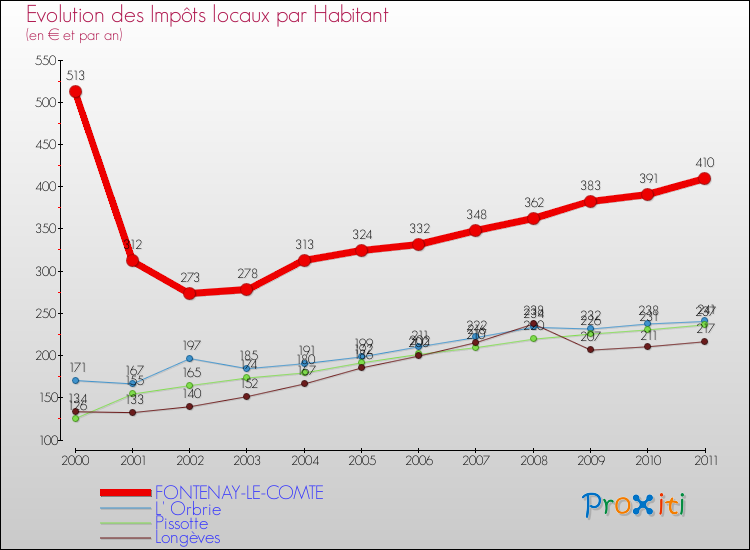 Pendant la même période, les communes françaises similaires à Fontenay-le-Comte, ont vu leurs impôts locaux par habitant augmenter de 0.63 % en moyenne entre 2000 et 2011.