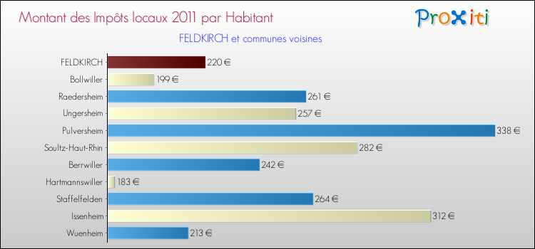 A noter : la valeur moyenne des impôts locaux dans les communes françaises similaires à Feldkirch était de 269 € par habitant, en 2011.
