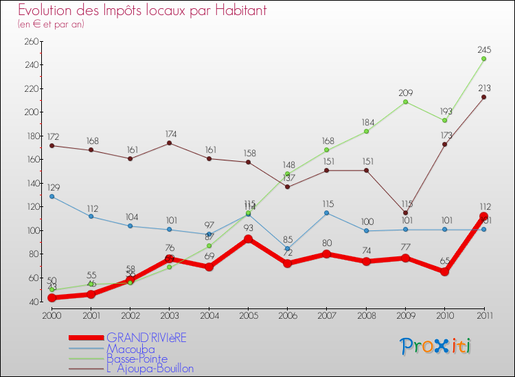A Grand'Rivière, les impôts locaux par habitant ont donc augmentés de 160.47 % entre 2000 et 2011.