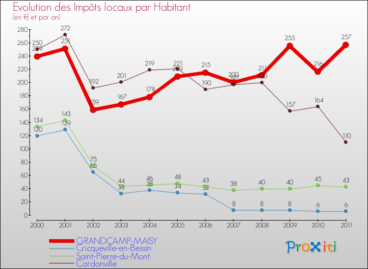 Pendant la même période, les communes françaises similaires à Grandcamp-Maisy, ont vu leurs impôts locaux par habitant augmenter de 16.03 % en moyenne entre 2000 et 2011.