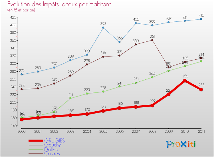 A Grugies, les impôts locaux par habitant ont donc augmentés de 49.36 % entre 2000 et 2011.