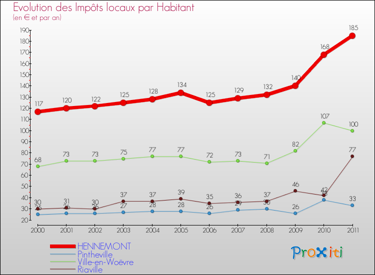 A Hennemont, les impôts locaux par habitant ont donc augmentés de 58.12 % entre 2000 et 2011.
