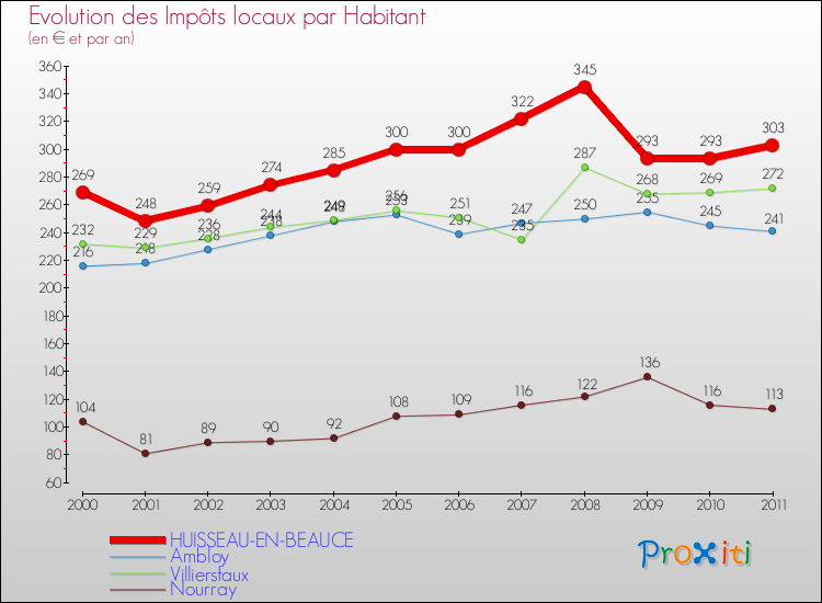 Le graphique ci dessous représente l'évolution des impôts locaux par habitant à Huisseau-en-Beauce depuis 2000.