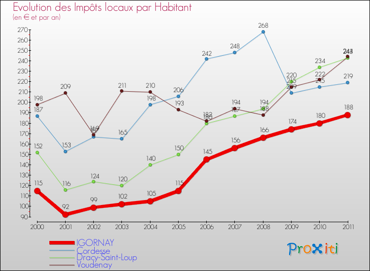 A Igornay, les impôts locaux par habitant ont donc augmentés de 63.48 % entre 2000 et 2011.