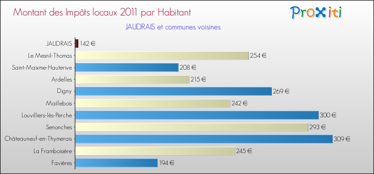 A noter : la valeur moyenne des impôts locaux dans les communes françaises similaires à Jaudrais était de 234 € par habitant, en 2011.