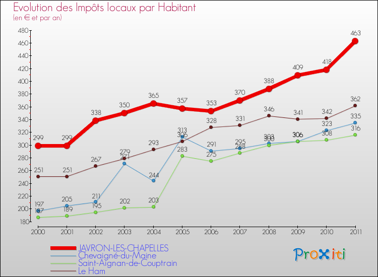A Javron-les-Chapelles, les impôts locaux par habitant ont donc augmentés de 54.85 % entre 2000 et 2011.